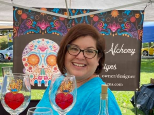 Rachel describes her work as deeply connected to her Latin heritage, frequently incorporating motifs like “sugar skulls,” which celebrate the lives and memories of loved ones. She has moved to more of a full-time artistry lifestyle after her retirement from her dental career. Her creations can be viewed at magicalalchemydesigns.com or at the Gallery.
